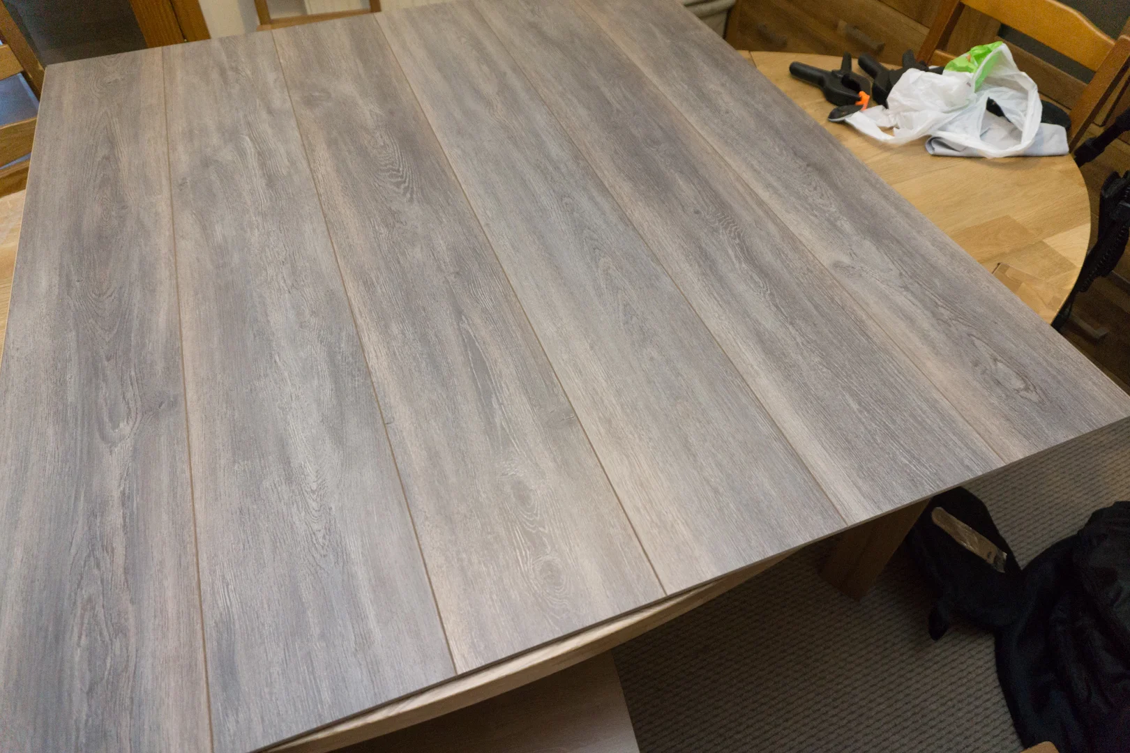 It's hard to see here but the most important factor here is that the wood bends upwards when you are locking it in, then gravity holds it in place on the floor. This is vital for the next step. Just to reiterate, if it was laid down assembled it should be bendable upwards so the pretty sides are getting closer together, but not bendable downwards so the rear sides could bend closer together. Have a play about with the samples in your own wood floor store and you will see what I mean.